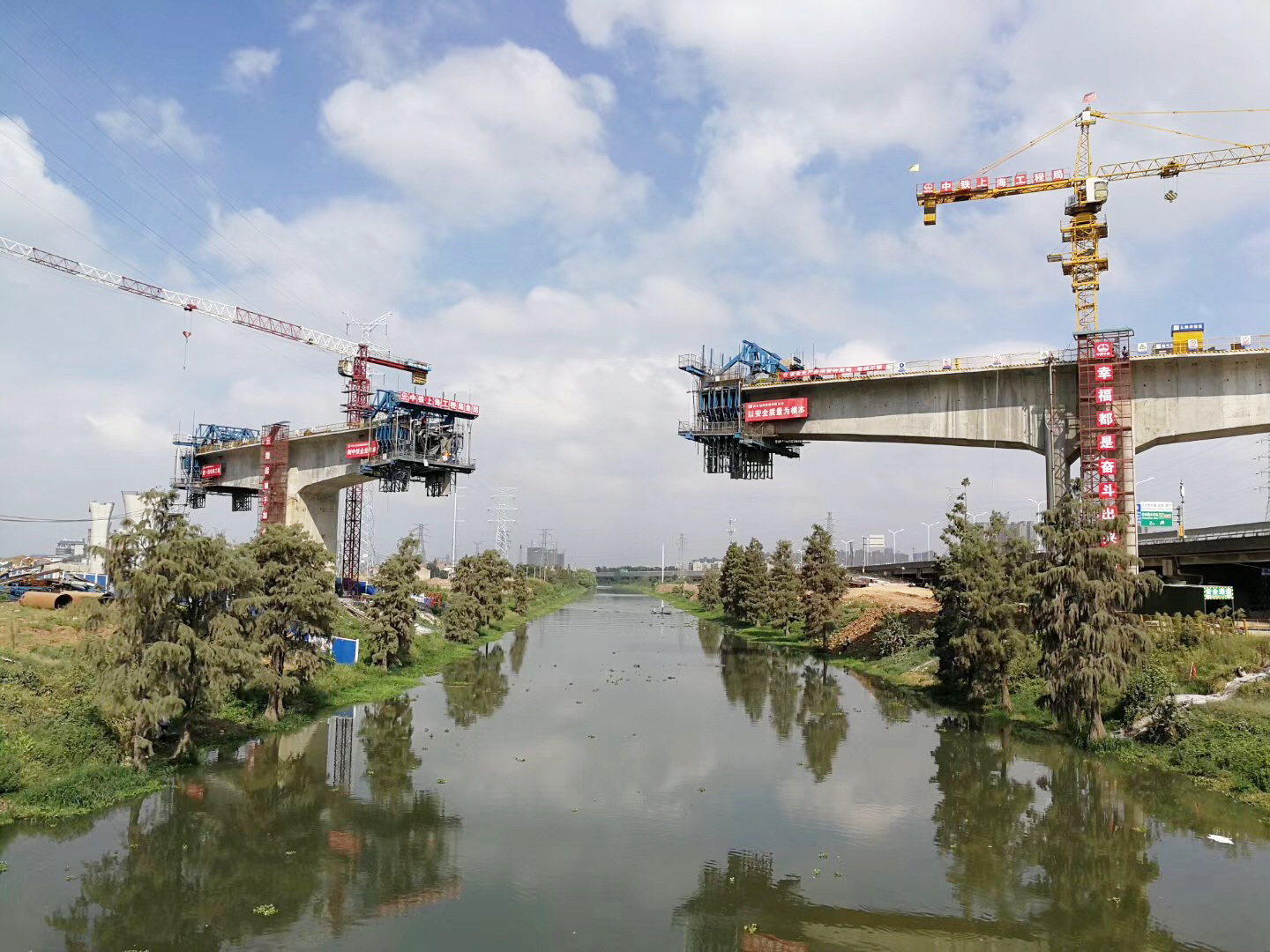 作為備受武漢百姓關(guān)注的工程,該標段面臨著管線改遷難度大、地質(zhì)條件差、掛籃難度高的難題。針對管線遷難題,項目部通過組織對管線進行詳細調(diào)查,制定了管線遷改方案,協(xié)助業(yè)主推動管線遷改,還針對110kv和220kv架空高壓走廊交叉和并行施工的情況,制定了高壓走廊安全防護方案,組織專業(yè)人員進行防護設(shè)施安裝,安排專人值守進行重點防控,有效推進管線改遷。由于該地區(qū)是巖溶地質(zhì),項目部采用“一樁一鉆”辦法實現(xiàn)樁位勘察全覆蓋,編制了巖溶專項施工方案,組織有區(qū)域內(nèi)巖溶處理經(jīng)驗豐富的協(xié)作隊伍進行施工,并在過程中加強監(jiān)測,有效化解熔巖地質(zhì)施工難題。針對小半徑曲線掛籃施工,項目部通過建立三維模型進行理論計算分析,采用“應(yīng)力—應(yīng)變”雙向控制的方法進行全過程管控,并安排專業(yè)監(jiān)控量測隊伍對懸臂掛籃法連續(xù)梁進行監(jiān)測,成功攻克了曲線掛籃施工難題。