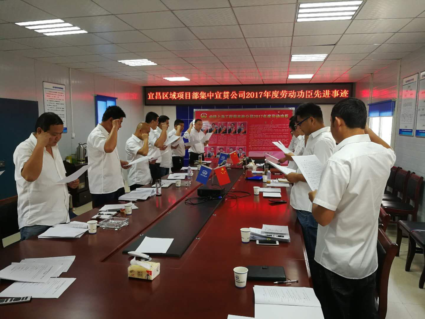 2018年4月16日晚,宣城市陽德路項目部組織員工集體學習公司2017年度“勞動功臣”宣誓活動。項目黨支部書記首先為大家逐一介紹了“勞動功臣”先進事跡以及為公司做出的優秀貢獻事跡,號召大家不論在任何崗位,都應該站在公司的角度,在做好本職工作的前提下,更要善于思考,勤奮學習,努力為公司創造效益,要杜絕懶惰、懈怠、固步自封、浮躁自滿的思想。隨后項目經理帶領全體員工進行了簽名和宣誓活動。此次活動的開展激起了員工的工作熱情,為項目部的搶工熱潮增添了力量。(賈夢雪)